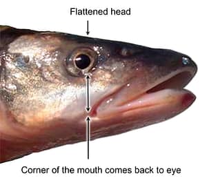 This species has a head that is somewhat flattened between the eyes, a long snout and a large mouth. You can usually insert 2 to 3 fingers fully into an 11-inch Northern Pikeminnow’s mouth.